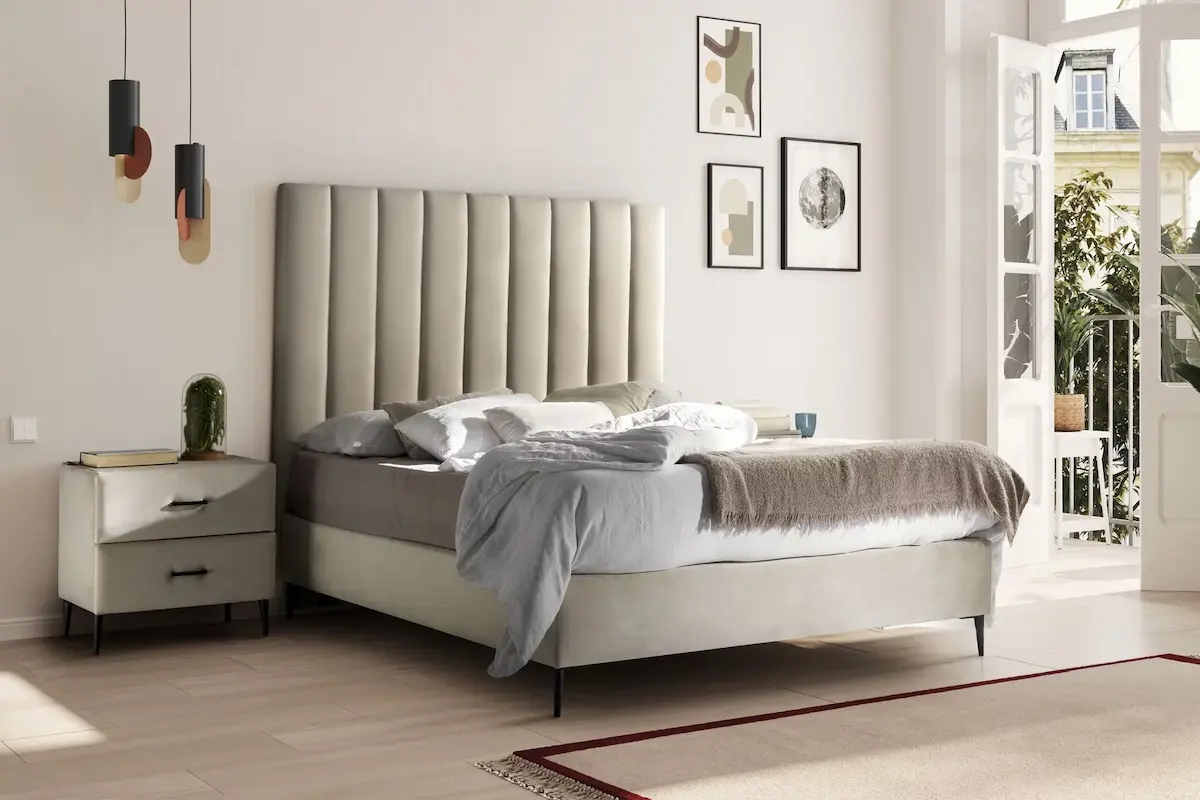 Lo ideal es que el cabecero sobresalga unos 5 a 10 cm por cada lado de la cama. Por ejemplo, si tu cama mide 150 cm de ancho, un cabecero de 160 o 170 cm quedará proporcionado. Esto hace que visualmente el conjunto se vea más equilibrado y, además, protege mejor la pared.
